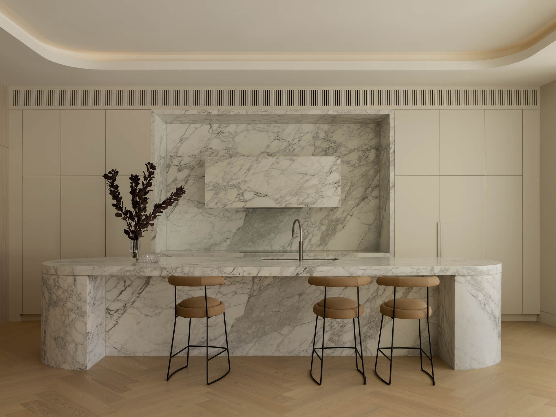 Designed for hosting as much as everyday life, the kitchen balances beauty and usability with effortless sophistication. A sculptural island, stone-clad rangehood, integrated appliances and ambient lighting combine to create a space that feels both elegant and intuitive.