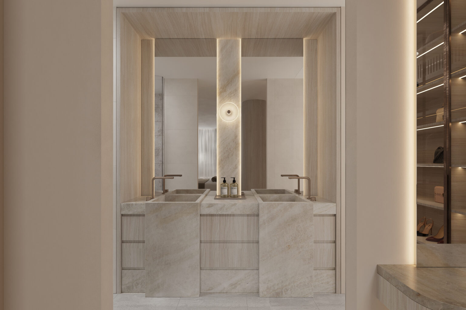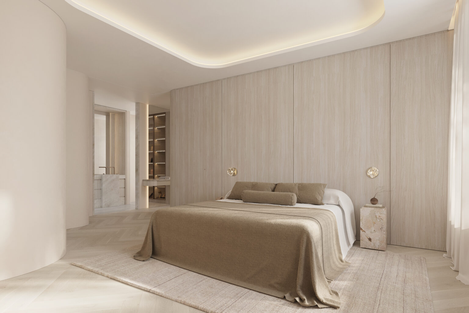 Soft, serene and richly layered, the master bedroom is a private retreat. Drawing from the design language of a boutique hotel, this space is defined by light walnut veneer, intricate stone detailing, and a restrained tonal palette that promotes rest and restoration.