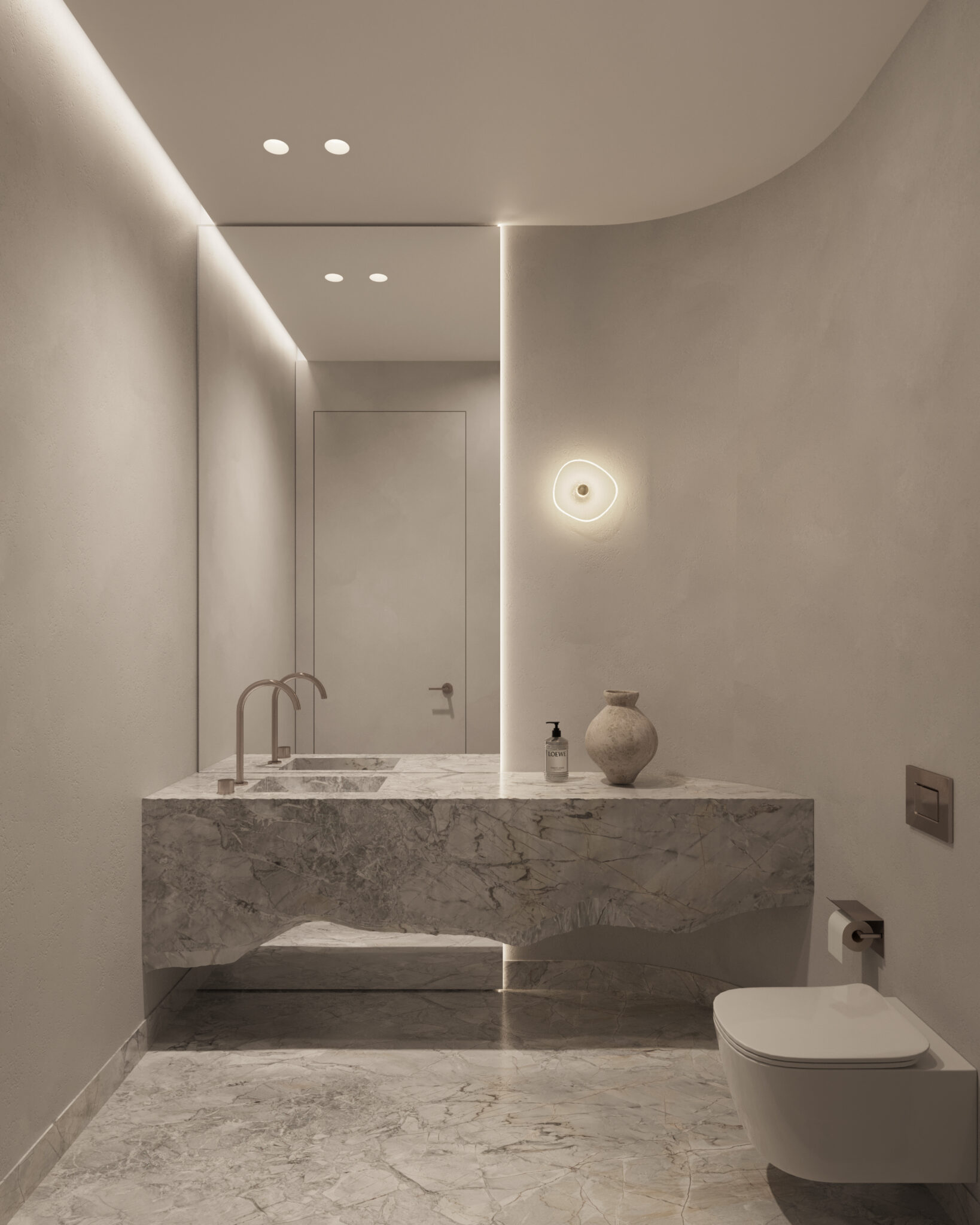 Calacatta Vagli marble introduces movement and elegance through its expressive veining, while Taj Mahal stone offers a softer, more restrained counterpoint. Together, they create depth and contrast, reinforcing the boutique-hotel sensibility while maintaining a cohesive interior visual language.